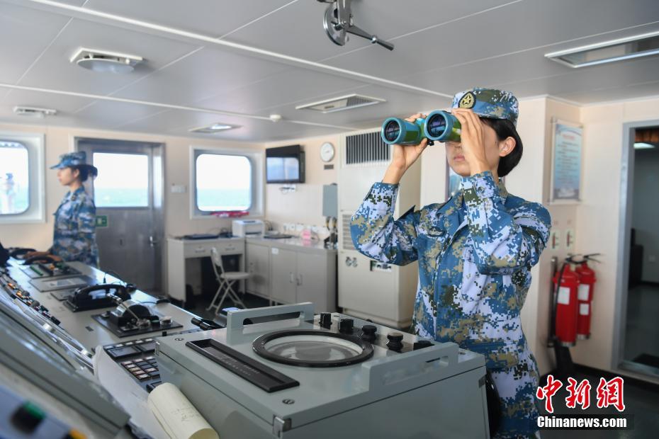 9月30日,操舵兵贾男在驾驶室值班。自9月13日出海以来,中俄“海上联合-2017”第二阶段军演的中国海军东平湖舰已经在海上航行了近20天,有6名女兵随舰出行,她们与其他男兵一起执行多项任务,轮流在信号、雷达、操舵等不同岗位值守。在工作训练之余,她们会聚在宿舍里读书交流,拉二胡是女兵们生活中不可缺少的“调味剂”。据了解,以前中国海军出海舰艇上是没有女兵的,自2008年开始有了第一批女舰员,到现在已经可以在中国海军许多舰艇上看见女兵风采。 中新社记者 任东 摄