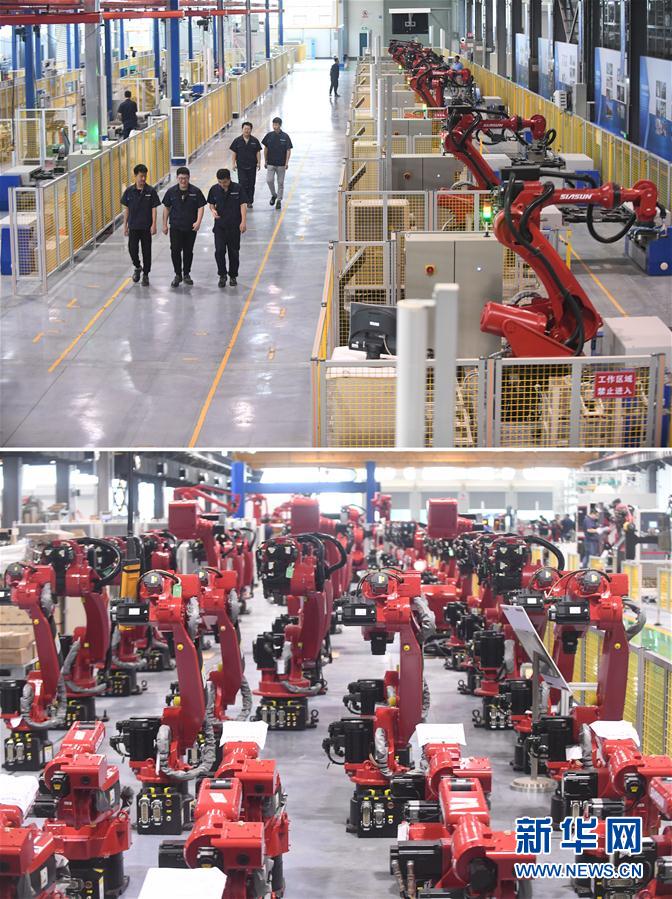 上图:沈阳新松机器人公司车间;下图:沈阳新松机器人公司生产的工业机器人(6月6日摄,拼版照片)。新华社记者 杨青 摄