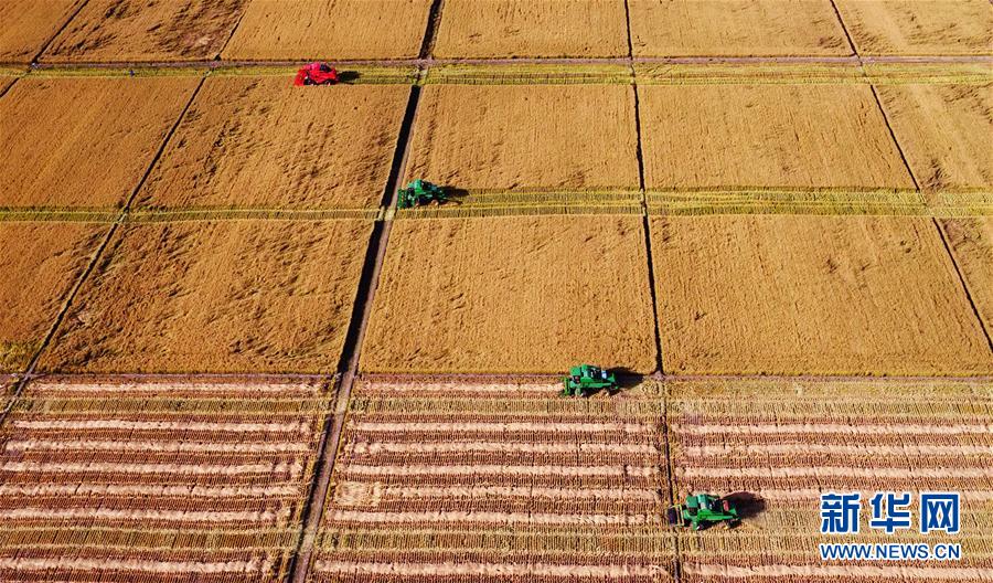 航拍黑龙江省浓江农场大型农机收割水稻(9月28日摄)。新华社记者 王建威 摄