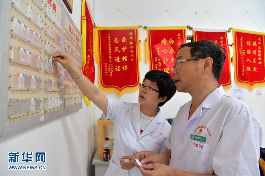 28载无怨无悔在江西省皮肤病专科医院康复中心,徐根保(右)和同事一起查看患者的就诊记录(9月29日摄)。新华社记者 彭昭之 摄
