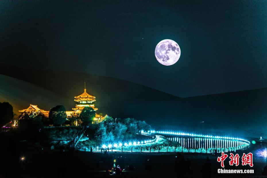 10月4日是中国传统中秋节,成千上万的游客当晚相聚在甘肃敦煌大漠中的月牙泉畔,登上鸣沙山共同守望难得一见的大漠圆月。当一轮超大圆月升起在月牙泉上空的时候,整个鸣沙山开始沸腾,大批游人一边赏月,一边谈论着在月牙泉赏月的别样情趣,并拿出相机或手机留住这段美好而难忘的记忆。当晚,敦煌月牙泉小镇还举办了一场大型的拜月、祭月活动,吸引了众多游客参与其中。 王斌银 摄