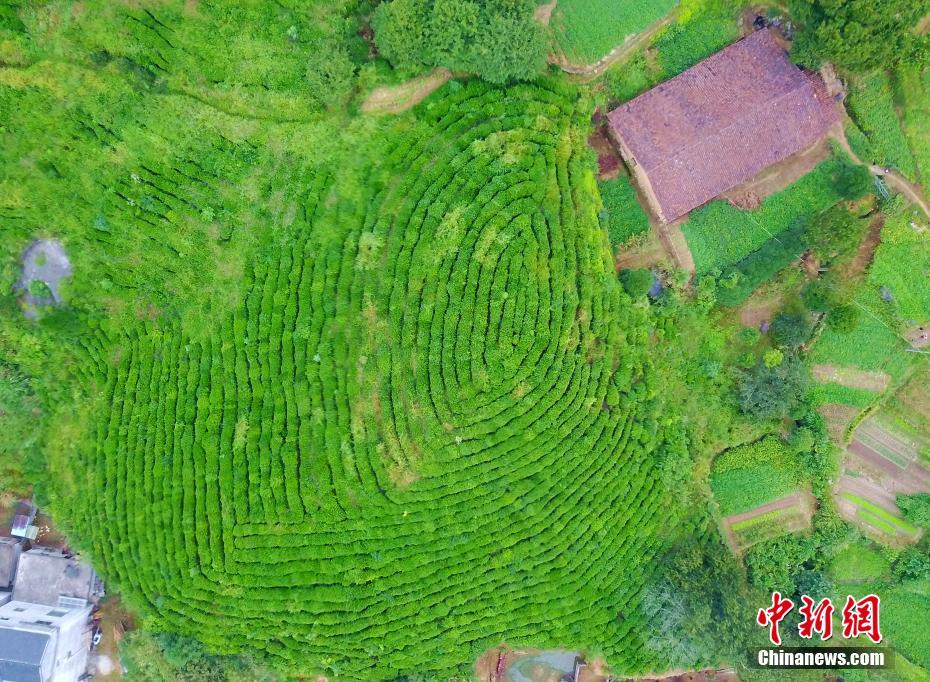 从空中鸟瞰江西省上饶县华坛山镇桐西村,村口的千年银杏树,一排排新建的房屋鳞次栉比,青山、小河、村庄融为一景。10月4日,航拍下的沿山茶林犹如巨人的指纹,奇景美不胜收。桐西村属全省最贫困的村之一,当地精准扶贫攻坚战打响以来,该村立足实际,大力推进村庄整治,着力把该村打造成旅游村,通过发展旅游产业带动贫困群众脱贫致富。 王剑 摄