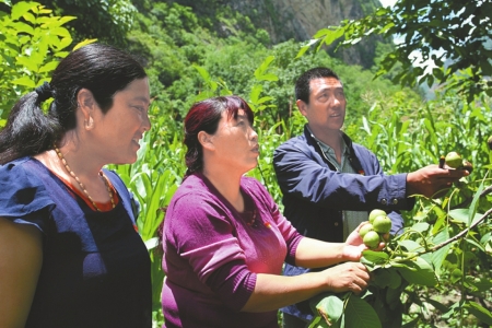 余德春(中)和村里的其他干部一起查看核桃种植基地。