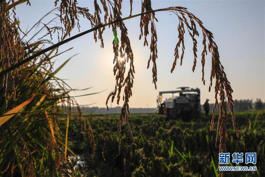 10月9日,江苏省淮安市盱眙县穆店乡穆店村农民驾驶收割机在田间收割水稻。目前正值江苏淮安中晚稻收割高峰期,田间一派忙碌的丰收景象。 新华社发(周海军 摄)