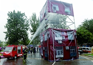 为了检测这种“迷你”消防车的效果,昨天,街道特意在龙潭公园门口搭建了一个十多米高的老旧居民楼模型,并模拟了失火现场。两三分钟后,“迷你”消防车开到现场将火扑灭。东城区龙潭街道办事处公共安全管理办公室副主任金周告诉北京晨报记者,龙潭地区辖区的297栋居民楼中,上世纪五六十年代建起来的居民楼就有111栋,平房院落78个。面对最窄只有两米多宽的小胡同,大型消防车根本无法开进,由消防员拖着水带跑进小区,一定程度上延误了灭火时间。这次龙潭地区购置的“迷你电动消防车”,大小和普通的快递车差不多,可以轻松地直接开进老旧小区,开到居民家的楼门口。车上还配置了信息图像采集系统,可以实时传输图像。