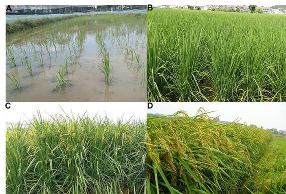 图为巨型稻不同生长时期田间表型注:A,苗期;B,分蘖期;C,抽穗期;D,成熟期;图D中左边高杆为巨型稻,右边矮杆为普通杂交稻。