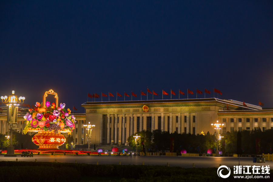 白天花团锦簇,夜晚熠熠生辉!10月21日,北京夜色璀璨,天安门广场上,喜迎十九大的巨型花坛美轮美奂。十里长街上,沿途的灯杆挂上大红灯笼、中国结,路口的主题花坛在灯光的点缀下成为街头的一道靓丽风景。(浙江在线记者 倪雁强 王夷 摄)