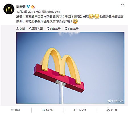 10月25日,有媒体从工商公开查询信息中获得来源,麦当劳(中国)有限公司已于2017年10月12日正式更名为金拱门(中国)有限公司。