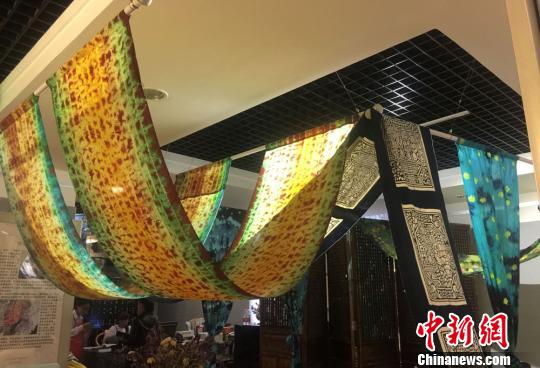 从10月23日开始,来自全国各地的30余名专家学者、非遗传承人在兰州交通大学进行为期一个月的染缬艺术研修学习,探讨非物质文化遗产传承与创新。图为兰州交通大学教授管兰生及其团队展示他们通过染缬技艺制作的作品。 刘玉桃 摄