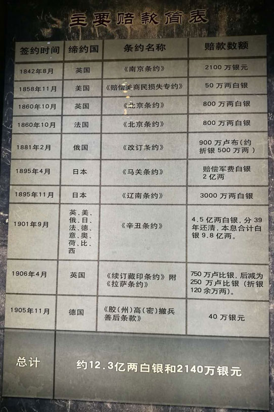 还有一份更沉重的统计数据:自1840年第一次鸦片战争起至1949年新中国成立止,外国侵略者强加给中国人民的不平等条约共计1182个;自鸦片战争到清政府垮台的70年中,中国仅赔偿一项连本带利总数达16亿两白银,平均每年负担对外赔款2285.7万两。