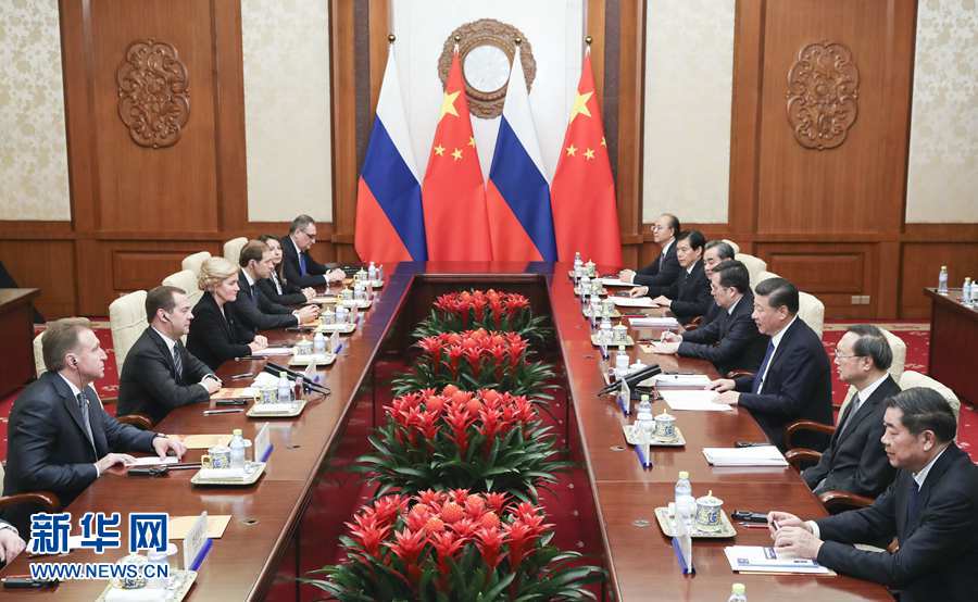 11月1日,国家主席习近平在北京钓鱼台国宾馆会见俄罗斯总理梅德韦杰夫。 新华社记者 庞兴雷 摄