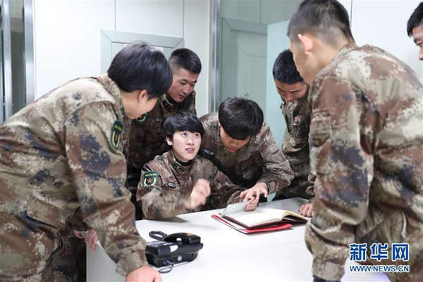 11月2日,党的十九大代表、吉林省军区数据信息室助理工程师张燕兵(中)来到吉林省军区综合训练队宣讲十九大精神。新华社发(屈雷宇摄)