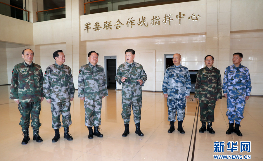 11月3日,中共中央总书记、国家主席、中央军委主席、军委联指总指挥习近平视察军委联合作战指挥中心,表明新一届军委贯彻落实党的十九大精神、推动全军各项工作向能打仗、打胜仗聚焦的鲜明态度。这是习近平带领军委一班人研究军委联指中心建设情况。新华社记者 李刚 摄