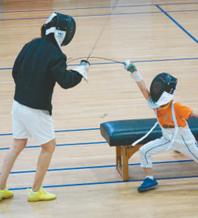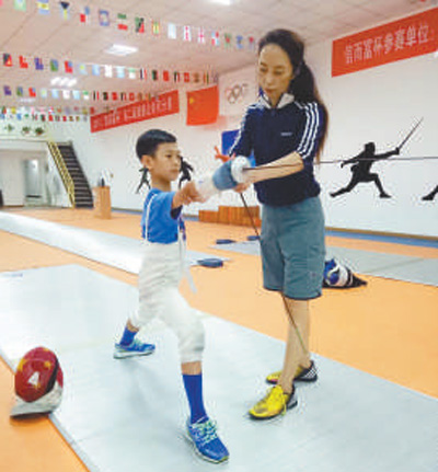 小朋友在教练的指导下练习击剑。孙欣 摄