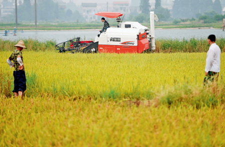 湖南省湘阴县收割机收割早稻 李尕摄/本刊