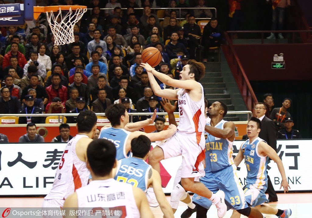 北京时间11月5日晚,2017-18赛季CBA联赛继续第4轮争夺,山东队主场迎战3连败的福建队。劳森因病缺阵,但山东队在丁彦雨航的带领下,在第四节锁定胜局,小丁拿到生涯新高的45分,帮助山东队以111-104击败福建取得连胜,福建遭遇四连败。四节比分分别是:26-21;23-29;27-25;35-29。图为丁彦雨航上篮。