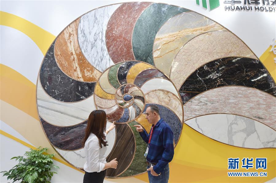 叙利亚客商默罕默德(右)在一家国内石材企业展位的“海螺状”石材墙前(11月8日摄)。11月8日,第十八届中国(南安)水头国际石材博览会在福建省南安市水头镇举办。