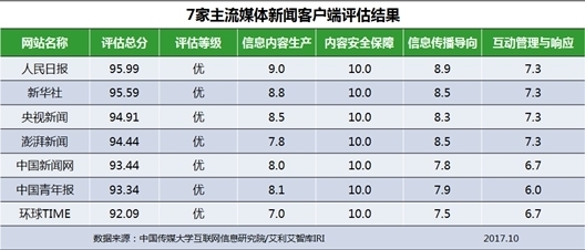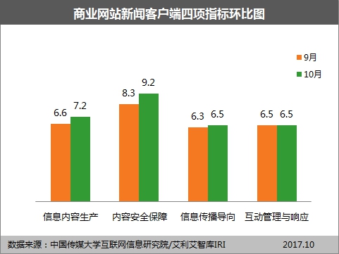新华网北京11月9日电(翟子赫)中国传媒大学互联网信息研究院9日发布的《新闻客户端信息生态指数2017年10月榜》显示,10月份主流媒体新闻客户端信息生态表现优,环比提升,信息内容生产方面能力突出,积极探索传播新亮点、新思路,耳目一新的“爆款”产品频现,取得了传播效果的重大突破。商业网站新闻客户端信息生态总体为良,信息内容生产、内容安全保障较上月有所提升,各指标还需继续加强。10月,各新闻客户端信息生态主要呈现以下特点: