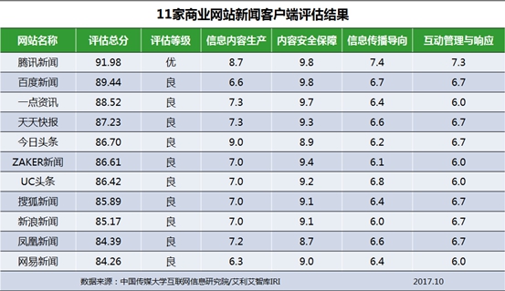 10月商业网站新闻客户端信息生态指数总分平均值为86.85,较上月提升5.15。其中,1家生态表现为优, 10家表现为良,腾讯新闻、百度新闻排名前列。11家商业网站新闻客户端评估结果如下: