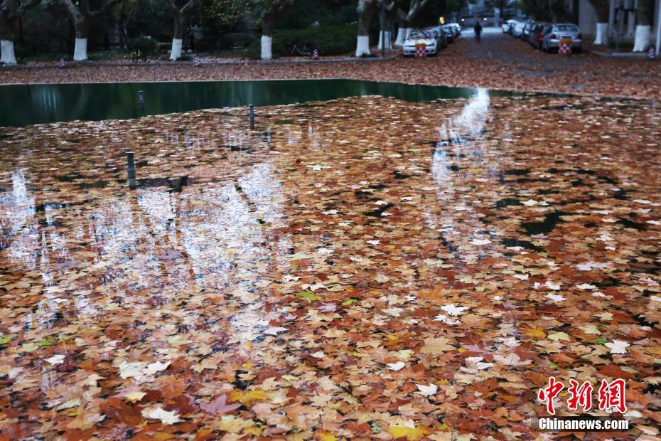 11月18日清晨,一场风雨过后,南京东南大学校园内的梧桐树叶纷纷落下,好似“地毯”均匀地铺在水池中。