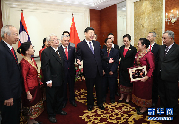 2017年11月14日,习近平在万象下榻饭店会见老挝奔舍那家族友人。 新华社记者兰红光摄