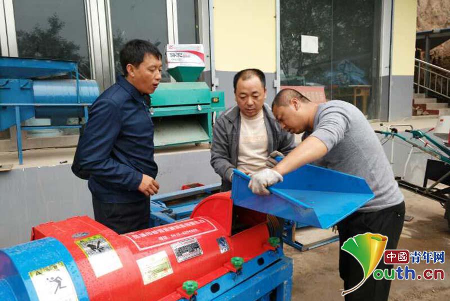 贺星龙(左一)正在帮乡亲们选购打谷子机器。本人供图