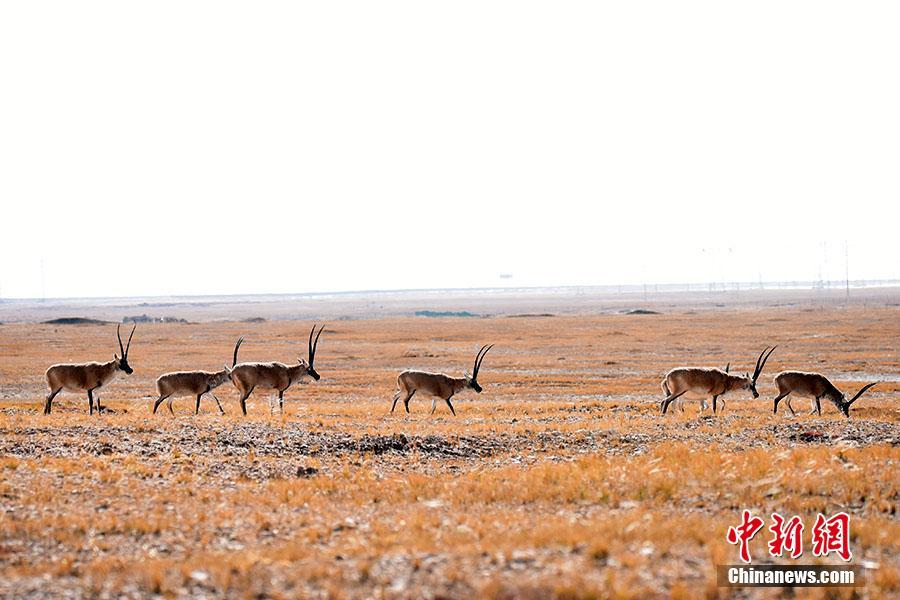 可可西里蒙语意为“美丽的少女”,位于青海西南部的玉树藏族自治州境内,面积4.5万平方公里,是目前中国最大的无人区。图为成群结队的藏羚羊辽阔的可可西土地上觅食。 切嘎 摄