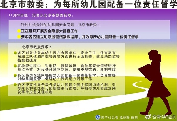 新华网11月27日电 近日,北京市教委要求为每所幼儿园配备一位责任督学。实现“幼有所育”,强化管理有必要,但更应补齐幼教发展短板。目前我国幼儿园师生比约为1:12,远低于国家标准。规范准入门槛,提高幼师待遇,培养幼教人才,难以一蹴而就,却是必须不懈努力的治本之策。 (据新华社“新华视点”微博报道)