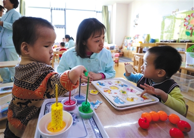 这是发生在北京市儿童福利院福娃娃特教幼儿园教室里的一幕,小男孩的玩具是为训练他双手的灵活度而设计。