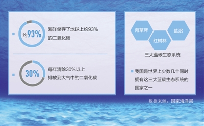 海洋储存了地球上约93%的二氧化碳,据估算为40万亿吨,是地球上最大的碳汇体,并且每年清除30%以上排放到大气中的二氧化碳。海岸带植物生物量虽然只有陆地植物生物量的0.05%,但每年的固碳量却与陆地植物相当。