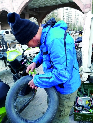 “我的车胎没气了,师傅您看看怎么回事。”一位骑着银灰色三轮车的保洁员把车停在路边。在昌平区天通西苑小区南门,太平庄中一街路口处,有个固定的自行车维修点,小区物业划定了4平方米区域,修车师傅何德玉跪在地上利落地取出内胎,检查漏气点。何德玉3岁时左手烫伤落下残疾,五根手指无法屈伸,这个圆脸皮肤黝黑的中年男子少言寡语,操起工具就埋头干活儿。