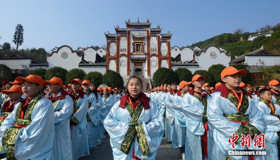 12月19日,湖北省秭归县屈原故里文化旅游区迎来荆州市研学旅行学生团队,700多名学生身着楚服行拜师礼,在集体诵读《楚辞》、学唱《招魂曲》等活动中,感受浓浓的巴楚文化和屈原文化。屈原故里文化旅游区位于秭归县新县城,毗邻三峡大坝,该景区将中华传统文化、巴楚文化、屈原文化、三峡文化融为一体,开展了礼拜屈原、拜师礼、诵读经典、划龙舟、包粽子等丰富多彩的研学活动,成为青少年学生研学旅行的热门之地。截至目前,该旅游区已累计接待研学旅行学生11万余人。图为诵读《楚辞》。 雷勇 摄