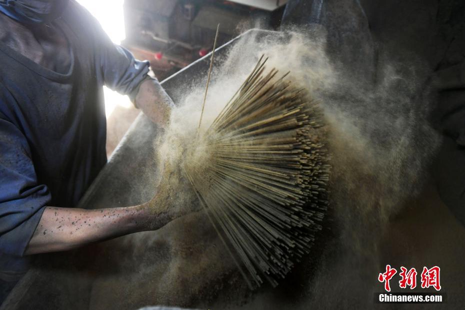 “一炷蒲香滿庭烟,香香韵味入丹田”,福建永春达埔镇制香已有300多年的历史,被誉为“中国香都”。如今,达埔共有制香企业296家,产品达300多种,年产值突破40亿元,已成为中国最大的制香基地之一。图为抡香——工人用双手手掌将香做圆形的转动,使香料均匀地附着在香支上,并适时地将有瑕疵的香挑出。