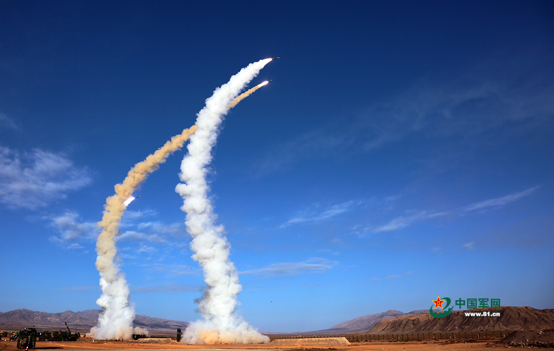 空军“蓝盾-2017S”决赛,地导弹某旅三枚导弹连射扑向临空多个目标。李明摄影