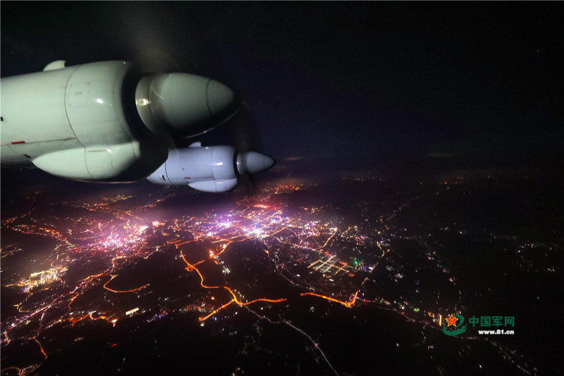 经过数小时的飞行,完成任务的运-9机群回到川西腹地,航线下方的城市灯火阑珊,此次任务在夜空下悄然落幕。刘应华摄影