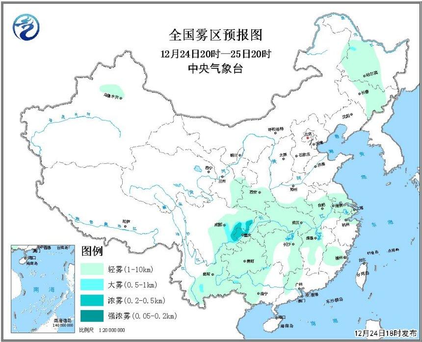 24日夜间,受冷空气影响,四川盆地大部地区霾略有减弱。25日早晨至上午,四川盆地中南部有大雾天气,局地有能见度低于50米的特强浓雾。