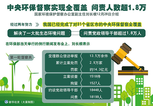 新华社北京12月28日电(记者高敬)国家环境保护督察办公室副主任刘长根28日介绍,经过两年努力,我国已经完成了对31个省区市的中央环保督察全覆盖,解决了一大批生态环境问题,问责党政领导干部超过1.8万人。