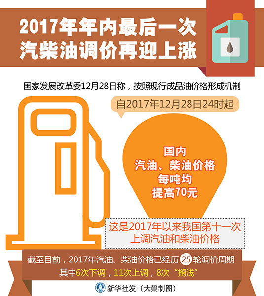 图表:2017年年内最后一次汽柴油调价再迎上涨 新华社发 大巢制图