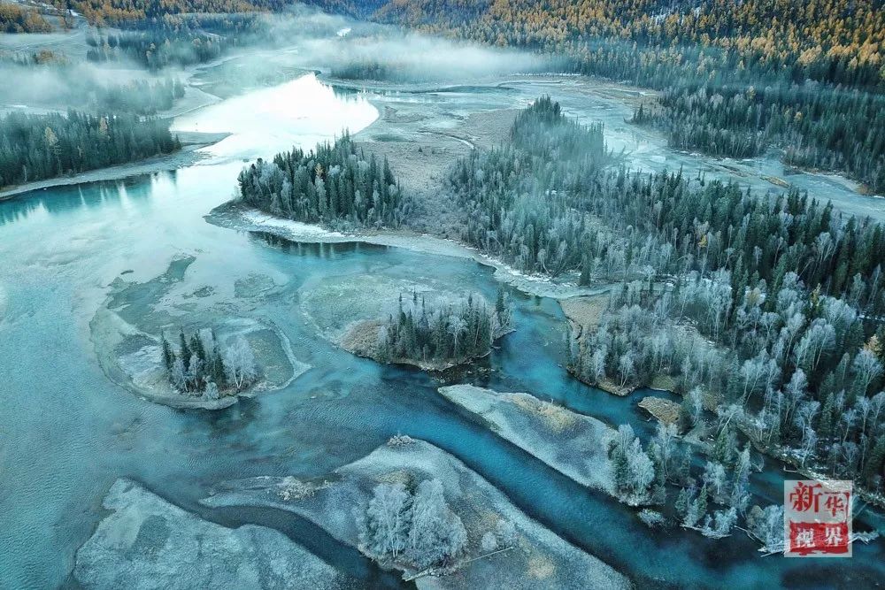 ▲ 2017年10月13日航拍的新疆喀纳斯景区内的树木与河流。深秋时节,新疆喀纳斯景区层林尽染、银装素裹,宛如一个梦幻般的迷人童话世界。新华社记者 刘续摄