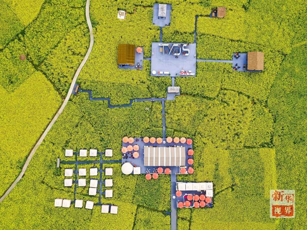 ▲ 2017年3月18日航拍的四川省崇州市重庆路边的油菜花田,当地村民在花田里摆上座椅待客。新华社记者 江宏景摄