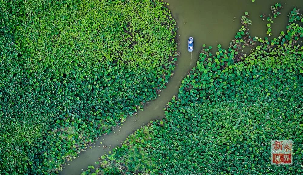 ▲ 2017年6月24日,在江苏南京市固城湖水慢城景区,一艘小船驶过荷塘。新华社记者 李响摄