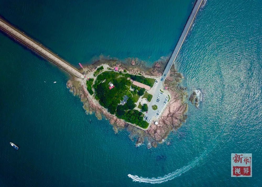 ▲ 2017年8月10日航拍的山东小青岛。小青岛面积仅为0.024平方公里,海拔17米,岛距东侧海岸370余米,有长长的海堤与陆地相接。此岛原是陆地的一部分,在海浪长年累月的冲蚀雕凿下,渐与陆地分离,始成今日之形状。新华社记者 王建华摄