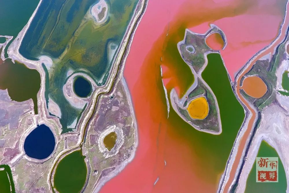 ▲ 2017年4月13日航拍的山西运城盐湖一角。随着季节变化,位于山西省南部的运城盐湖呈现出不同的颜色,犹如大地上的巨型调色板。新华社记者 詹彦摄