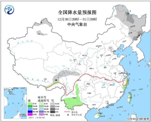 此外,30日20时至31日20时,新疆北部山区、内蒙古东北部、东北地区中北部、青海南部、川西高原北部等地的部分地区有小到中雪或雨夹雪,其中吉林东部局地有大雪;台湾海峡、南海东北部和西南部的部分海域风力可达8级、阵风9级。