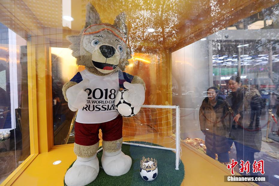 12月30日,2018年俄罗斯世界杯足球赛吉祥物“西伯利亚平原狼”扎比瓦卡现身南京新街口苏宁体育商茂店,一同亮相的还有世界杯玩偶、足球豪门俱乐部球员战靴、球星萨内蒂和特谢拉的签名球衣等,吸引了大批球迷和运动爱好者前来零距离感受独特的体育文化。泱波 摄
