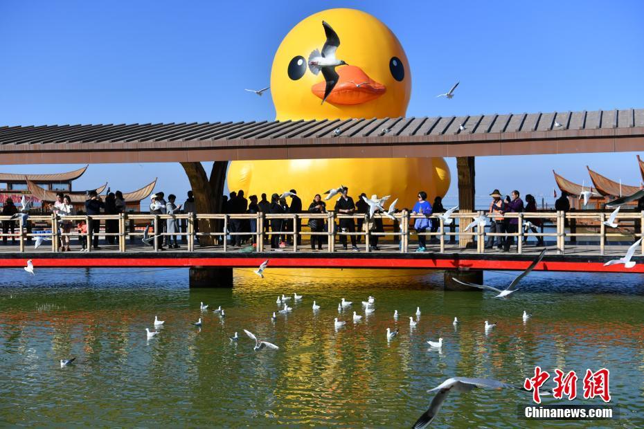 昆明滇池边的红嘴鸥围绕大黄鸭盘旋。 中新社记者 任东 摄