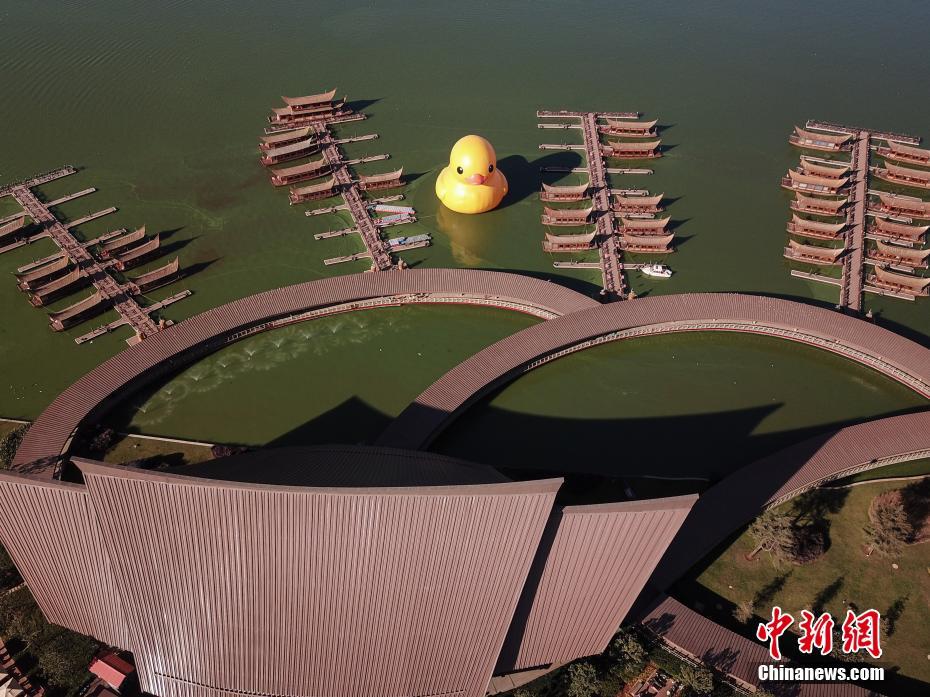 “大黄鸭”在昆明滇池停靠。 中新社记者 任东 摄