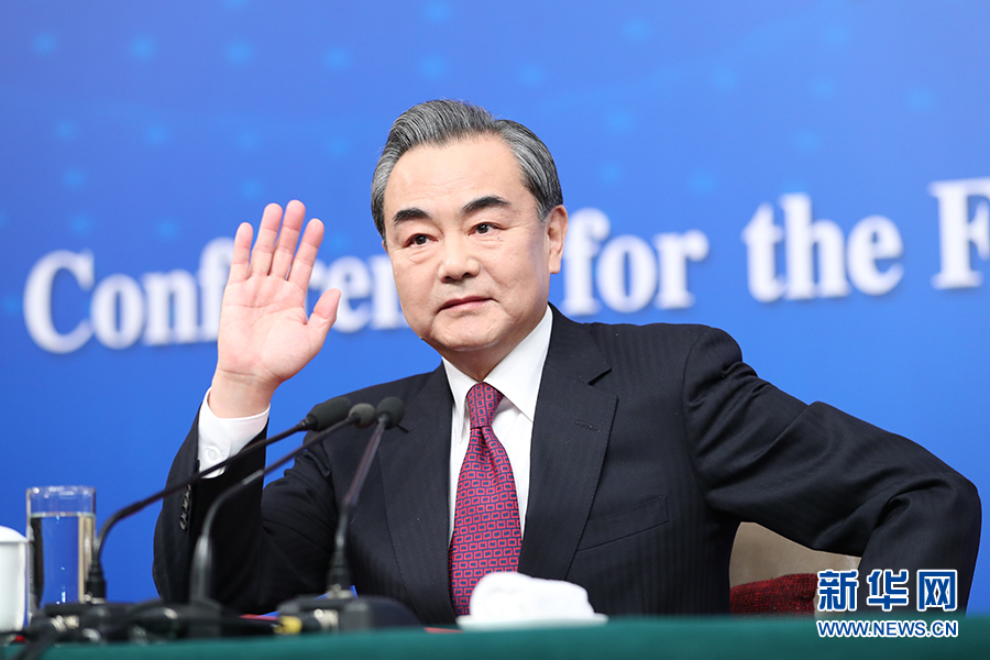 十二届全国人大五次会议新闻中心于3月8日(星期三)10时在梅地亚中心多功能厅举行记者会,邀请外交部部长王毅就“中国的外交政策和对外关系”的相关问题回答中外记者的提问。图为外交部部长王毅向记者示意。新华网/中国政府网 孙韬 摄