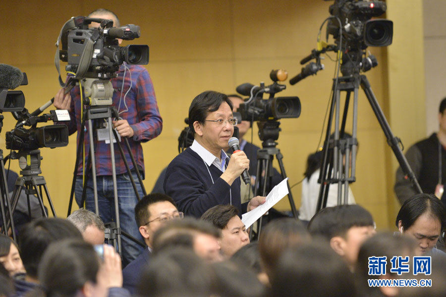 3月10日,十二届全国人大五次会议新闻中心举行记者会,邀请中国人民银行行长周小川、副行长易纲、副行长兼国家外汇管理局局长潘功胜、副行长范一飞就“金融改革与发展”的相关问题回答中外记者的提问。图为路透社记者提问。新华网/中国政府网 王健 摄