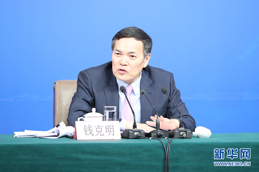 3月11日,十二届全国人大五次会议新闻中心举行记者会,主题是“改革开放调结构 创新驱动促发展”,商务部部长钟山、副部长王受文、副部长钱克明出席并回答中外记者的提问。图为商务部副部长钱克明回答记者提问。 新华网/中国政府网 傅义洲 摄